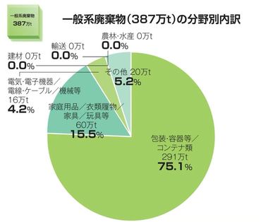 一般系廃棄物においては、包装・容器等/コンテナ類が全体の75.1%を占めており、産業系廃棄物では、包装・容器等/コンテナ類の割合は18.2%ことがわかります。